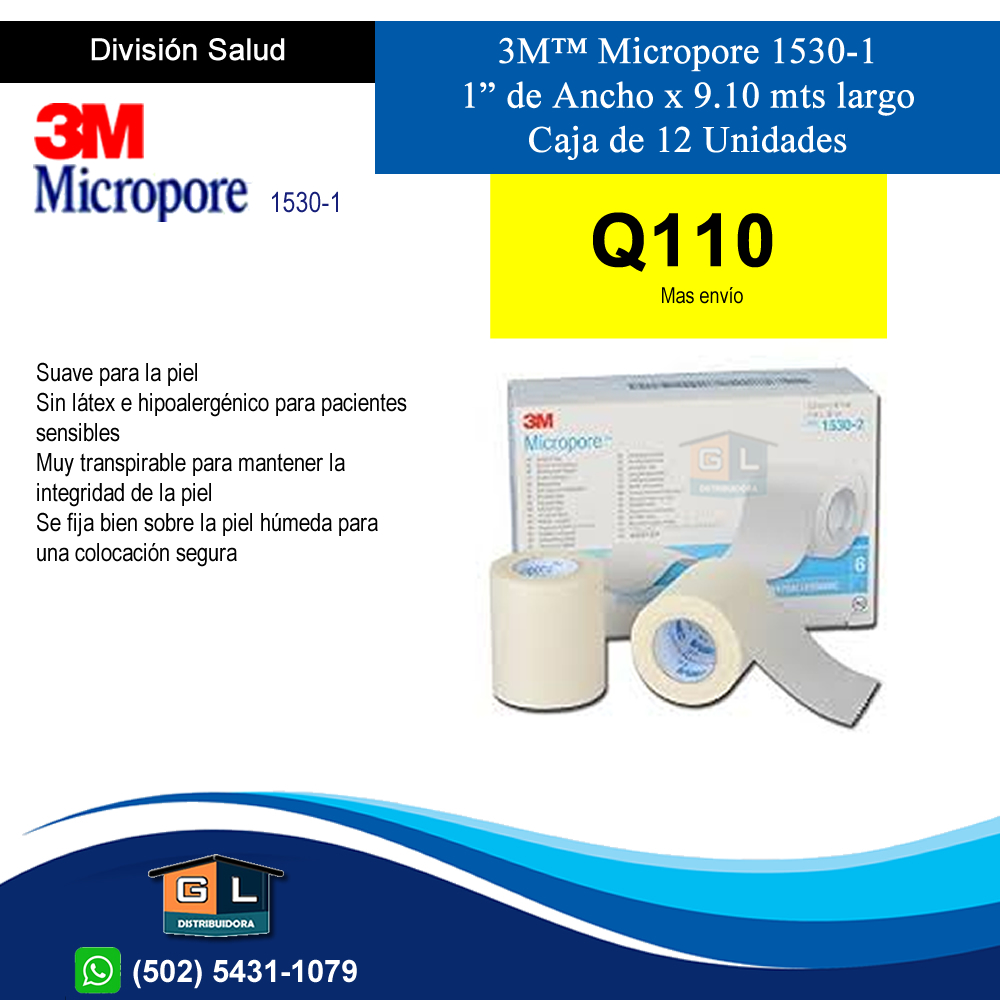 3M™ Micropore 1530-1 1” de Ancho x 9.10 mts largo Caja de 12 Unidades