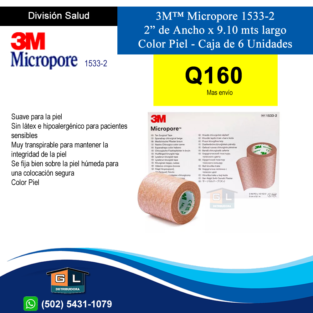 3M™ Micropore 1533-2 Color Piel 2” de Ancho x 9.10 mts largo Caja de 6 Unidades