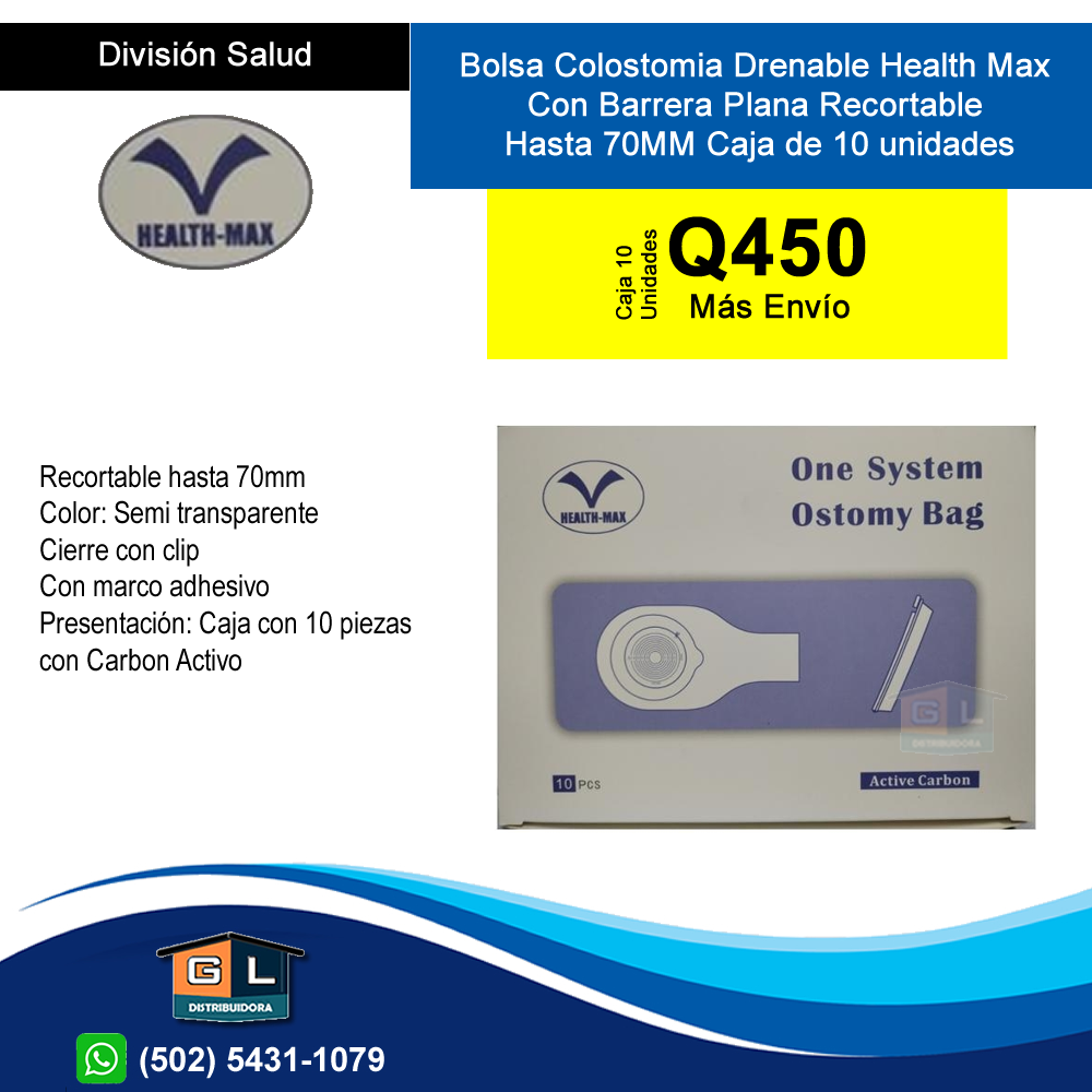 Bolsa Colostomia Drenable Health Max Con Barrera Plana Recortable Hasta 70MM Caja de 10 piezas