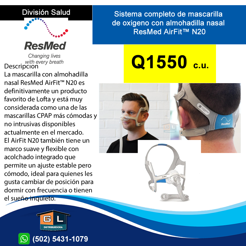 Sistema completo de mascarilla de oxigeno con almohadilla nasal para Apnea CPAP ResMed AirFit™ N20